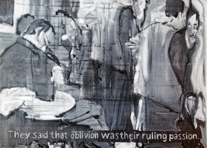 2021They said that oblivion was their ruling passion. Cafe-interieur. (onder)titel en beeld afkomstig uit een filmstill van de film "On the passage of a few persons through rather a brief moment in time" uit 1959 van de filosoof Guy Debord.