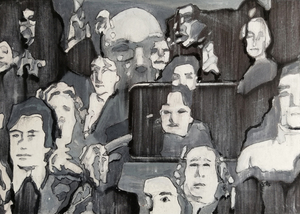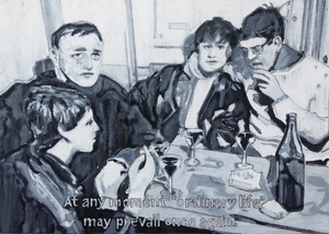 2021Cafe-interieur. (onder)titel afkomstig uit een filmstill van de film "On the passage of a few persons through rather a brief moment in time" uit 1959 van de filosoof Guy Debord, het beeld geinspireerd op een foto van Ed van der Elsken uit het fotoboek "Love on the west bank"