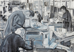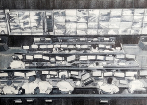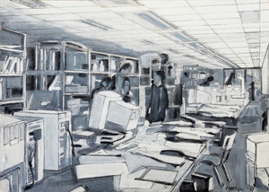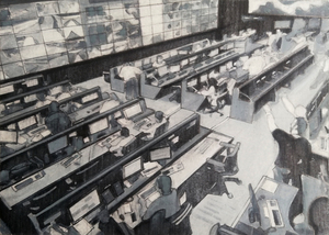 Interieur architectenbureau en tijdsbeeld - het architectenbureau OMA in Rotterdam, jaren '90, gebaseerd op een filmstill van een documentaire over het bureau van Rem Koolhaas, onderdeel van een serie "The powers that be."
