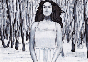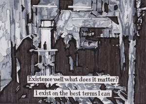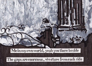 2019Een interieur, een vrouw zit aan een bed, een man ligt er in. Beeld gebaseerd op een film-still van de film "Stalker" uit 1979 van de Russische regiseur Andrej Tarkovsky. De begeleidende tekst, "Me in my own world, yeah you there beside. The gaps are enormous, we stare from each side." is een fragment uit het lied "I remember nothing" van de plaat "unkonwn pleasures" uit 1979 van Joy Division, geschreven door Ian Curtis.