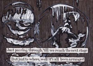 2019Een man onderweg door een tunnel of een rioolbuis, door "the zone", gebaseerd op een filmstill uit de film "Stalker" uit 1979 van Andrej Tarkovsky. De begeleidende tekst "Just passing through, 'till we reach the next stage. But just to where, well it's all been arranged." komt van het nummer "From safety to where" eveneens uit 1979 van de band Joy Division, geschreven door Ian Curtis.