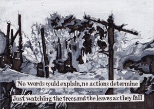 2023Een vervallen constructie voor een electiciteitsdraad, overwoekerd door klimop en natuur, gebaseerd op een film-still uit de film "Stalker" uit 1979 van de Russische regiseur Andrej Tarkovsky. De begeleidende tekst, "No words could explain, no actions determine. Just watching the trees and the leaces as they fall." is afkomstig uit het lied "The eternal" van het album "Closer" uit 1980 van de band Joy Division geschreven door Ian Curtis.
