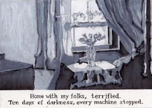 2019Een interieur, een bos bloemen op tafel, een gordijn, geen mensen. Beeld gebaseerd op een film-still uit de BBC documentaire "All watched over by machines of loving grace" van de Britse documentairemaker Adam Curtis, waarin hij stelt dat machines gefaald hebben de mensheid te bevrijden en in plaats daarvan geleid hebben tot een verwrongen en versimpeld beeld van de wereld om ons heen. De titel "where were you during the blackout" en de begeleidende tekst "Home with my folks, terrified. Ten days of darkness, every machine stopped." zijn fragmenten van het filmscript van de film Blade Runner 2049 van de filmmaker Denis Villeneuve uit 2017.