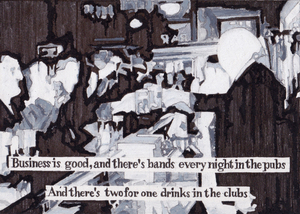 2019Interuer van een bar, een man staat eenzaam in zichzelf gekeerd, gebaseerd op een film-still uit de film "Stalker" uit 1979 van de Russische filmmaker Andrej Tarkovski. De begeleidende text "Existence, well what does it matter, I exist on the best terms I can." is afkomsitig uit het lied "Heart and soul" van het album "closer" uit 1980, geschreven door Ian Curtis
