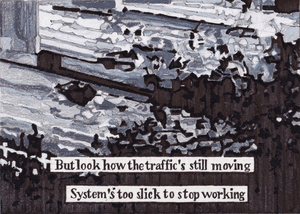 2019Europe is lost - But look how the traffic's still moving, gebaseerd op een film-still uit de gelijknamige videoclip gemaakt door Manuel Braun op basis van found footage. De begeleidende tekst: "Look how the traffic's still moving. Systems too slick to stop working" is een fragment van het lied "Europe is Lost" afkomstig van het album "Let them eat chaos" uit 2016 van Kae Tempest.