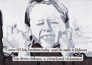 2019Europe is lost - 'Cause it's Big Business - gebaseerd op een film-still uit de gelijknamige videoclip gemaakt door Manuel Braun op basis van found footage. De begeleidende tekst: "'Cause it's big business baby and its smile is hideous. Top down violence, a structural viciousness." is een fragment van het lied "Europe is Lost" afkomstig van het album "Let them eat chaos" uit 2016 van Kae Tempest.