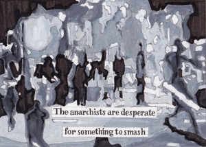 2019Europe is lost - The anarchists are desperate, gebaseerd op een film-still uit de gelijknamige videoclip gemaakt door Manuel Braun op basis van found footage. De begeleidende tekst: "The anarchists are deperate for something to smash" is een fragment van het lied "Europe is Lost" afkomstig van het album "Let them eat chaos" uit 2016 van Kae Tempest.