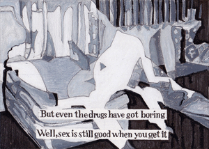 2019Europe is lost - But even the drugs have got boring, gebaseerd op een film-still uit de gelijknamige videoclip gemaakt door Manuel Braun op basis van found footage. De begeleidende tekst: "But even te drugs have got boring. Sex is still good when you get it " is een fragment van het lied "Europe is Lost" afkomstig van het album "Let them eat chaos" uit 2016 van Kae Tempest.