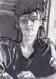 2018Portret gebaseerd op fragment van een krantenfoto, waarschijnlijk uit de Volkskrant, uitgegeven ergens tussen 2005 en 2018. Los van de context, los van de inhoud en los van de gebeurtenis probeer ik een vervliegend moment (niets veroudert zo snel als krantennieuws) langer vast te houden en te laten zien dat het altijd om mensen draait, ook al weten we niet wie het is. De text op haar t-shirt is geschreven in een taal die ik niet spreek, ze maakt waarschijnlijk onderdeel uit van een demonstratie.
