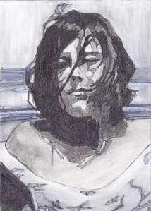 2018Portret gebaseerd op fragment van een krantenfoto, waarschijnlijk uit de Volkskrant, uitgegeven ergens tussen 2005 en 2018. Los van de context, los van de inhoud en los van de gebeurtenis probeer ik een vervliegend moment (niets veroudert zo snel als krantennieuws) langer vast te houden en te laten zien dat het altijd om mensen draait, ook al weten we niet wie het is. Ze is waarschijnlijk gewond geraakt in een demonstratie, mogelijk in Wit-Rusland.
