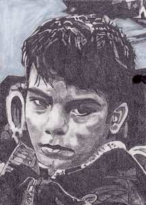 2018Portret gebaseerd op fragment van een krantenfoto, waarschijnlijk uit de Volkskrant, uitgegeven ergens tussen 2005 en 2018. Los van de context, los van de inhoud en los van de gebeurtenis probeer ik een vervliegend moment (niets veroudert zo snel als krantennieuws) langer vast te houden en te laten zien dat het altijd om mensen draait, ook al weten we niet wie het is. De tank op de achtergrond van het jongetje maakt duidelijk dat de foto waarschijnlijk in Syrië genomen is.