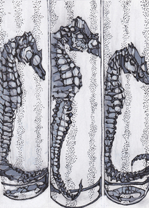 2018Tekening van 3 zeepaardjes, geconserveerd in een fles. Een wetenschappelijke blik op een natuurlijk fenomeen.